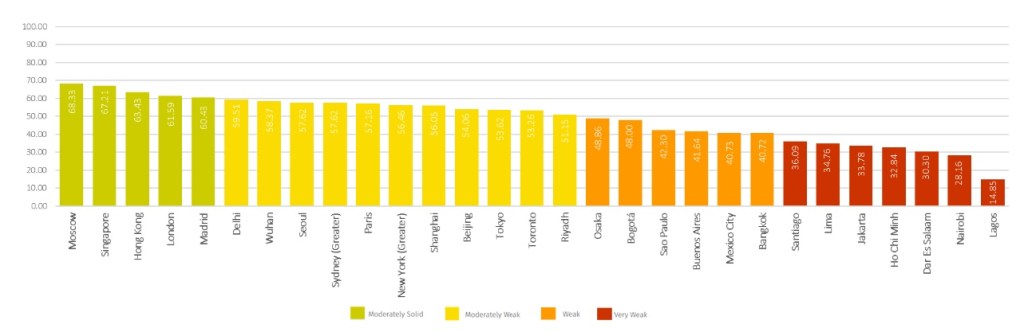 Let’s have a quick look at the UN report [annoyingly only opens as a pdf]. It has six criteria: Productivity (and I recommend this recent book on that subject by Michael Haynes), Infrastructure, Quality of Life, and Equity, Environment, and Governance. The premise of the index itself is a little misleading, as it only includes 29 cities in the first place, and there is no clear rationale for selection. We get Delhi, but not Karachi. There’s New York, but no Los Angeles. The exercise seems unintentionally set up to flatter metropolises with lots of mass transit urban mobility, well-paid jobs, housing growth, educational attainment, public space. Note that Quality of Life is a measure independent of Social Inclusion and Equity – the latter only includes income equality as a minor measure with ‘women in local government’ getting as much weight. The index draws on existing UN Sustainable Development Goal indicators (I teach a course on this topic) and adds a few more relating to ‘tech’, airports, road congestion (still a notorious problem in Moscow), science and education, culture and recreation, and e-governance.
