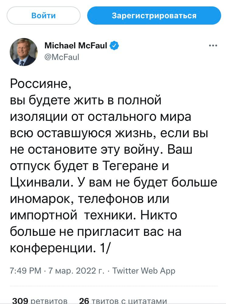 McFaul is a fool. He learned nothing from his time in Russia. Mean and pathetic simply because he isn’t the first one to claim that, he is just a copycat. And addressing all “Россияне” and saying “you need to stop this war” means he doesn’t understand a shit what is going on now here.