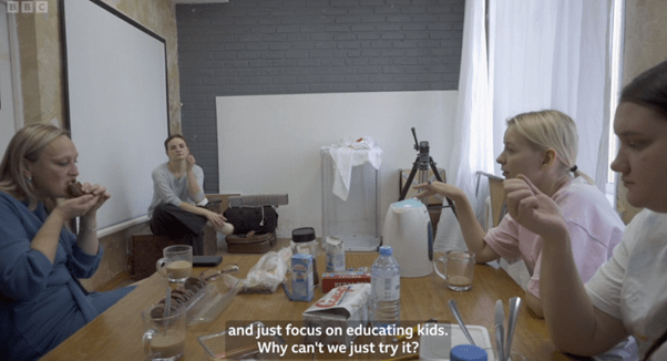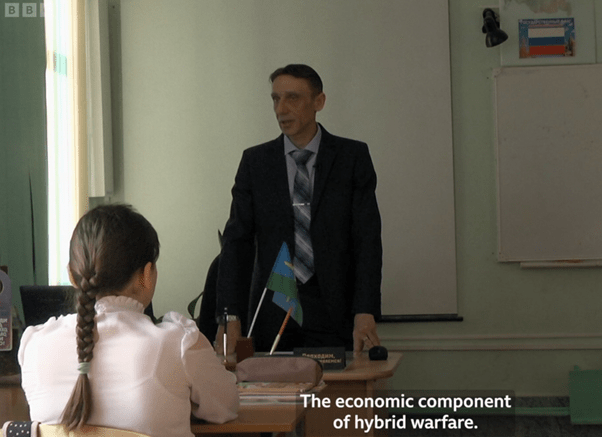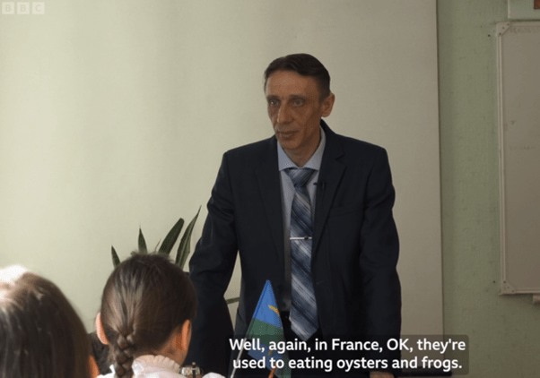 Overall however, the question of ‘indoctrination’ is the biggest weakness of the production and editing because any actual effect isn’t spelled out or illustrated. There is also a bit of cheating here – as has been pointed out, the scenes about former students becoming soldiers are manipulated to conflate ‘ordinary’ conscription with being sent to fight in Ukraine. We’re left with narrative lacunae. There’s also obfuscation of the topic of patriotic education itself. We discuss this in the podcast, but essentially the editing and narration give a false impression that the nationalistic agenda has taken over the school (in terms of time devoted to it), when in reality it’s a small part of the curriculum. Even so, we do witness teachers push back against it. A nice touch that might make you think, is the lesson on the historical destiny of Crimea as part of Russia. If even this is having to be drummed into kids in the most egregiously ham-fisted manner, one wonders about the enduring strength of ideology.