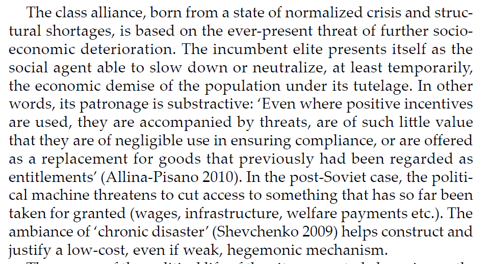 Like in my own work, however, Gorbach insists that informality in the microscale of people’s lives is just as important as patrimonialism. This is because the informal pacts and agreements, including the invisible ones like turning a blind eye to informal employment, represent a key political arrangement of life in contemporary Russia and Ukraine. These include ‘paternalism’, a key referent of Gorbach’s book. His overview is helpful in thinking of paternalism, clientelism and patrimonialism as all nested concepts (Gorbach credits me with coining informal ‘imbrication’ but others have found this term a bit pretentious). Forms of informal obligations comprise an overall mutualist web. Importantly there are coercive, exploitative but also solidaristic, empathetic and – as I expand in my book – fictive kinship relations which may be more or less enduring and binding. As Gorbach mentions – this perspective offers a sharp critique of rational actor/methodological individualist economy and political science approaches.