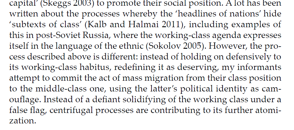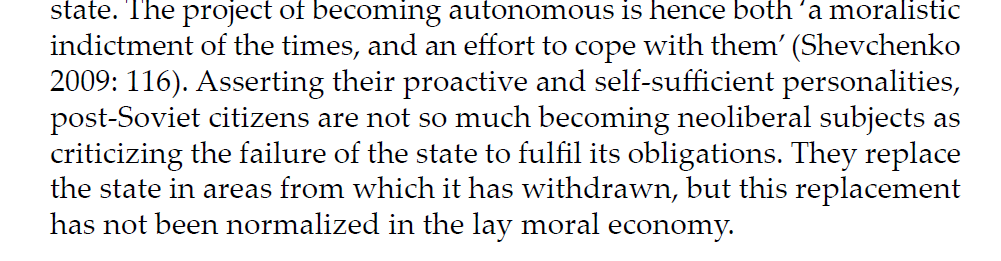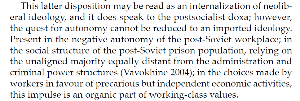 In Chapter 8, Gorbach shifts to a focus on everyday politics beyond the world of work, looking at strategies of self-valorization via class distinction. Here, he references Andrew Sayer, Bev Skeggs, Don Kalb, and of course Olga Shevchenko and Oleg Kharkhordin.