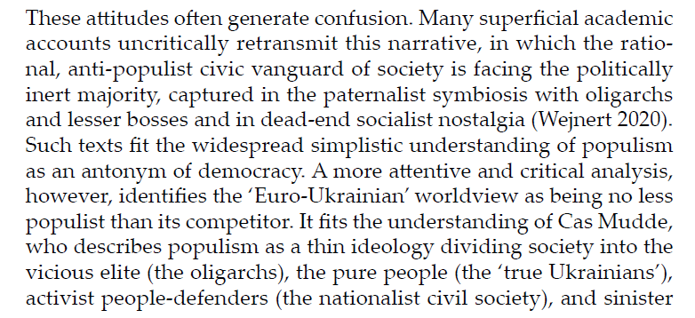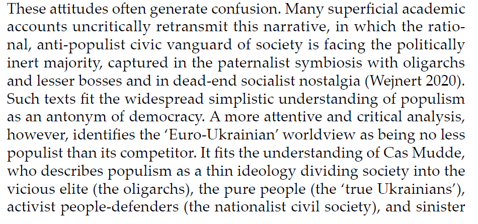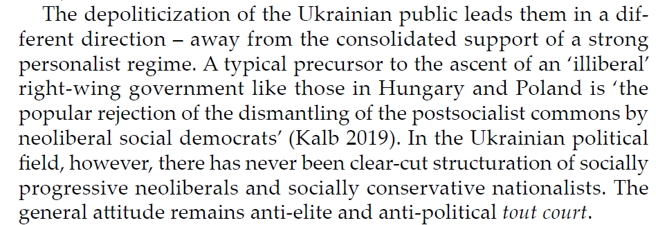 Gorbach gives more room to the breadth of ‘informality’ as applied to Post-Soviet politics – from Hale’s patronalism, to Matveev’s bureaucratic neopatrimonialism developing into Bonapartism. Here, Gorbach criticizes the application of Weberianism to the Ukrainian state, which can only result in seeing it as a ‘backwards’ essentialized ‘uncivilized’ polity and, indeed, plays into views that bifurcate into ‘good Ukrainian’ values (of and emanating from the West), and Bad Soviet values in the East. This will be a major target of Gorbach’s work and one that won him numerous enemies among established mainstream liberal scholars embedded in the West for whom it is beneficial to maintain this fiction.
