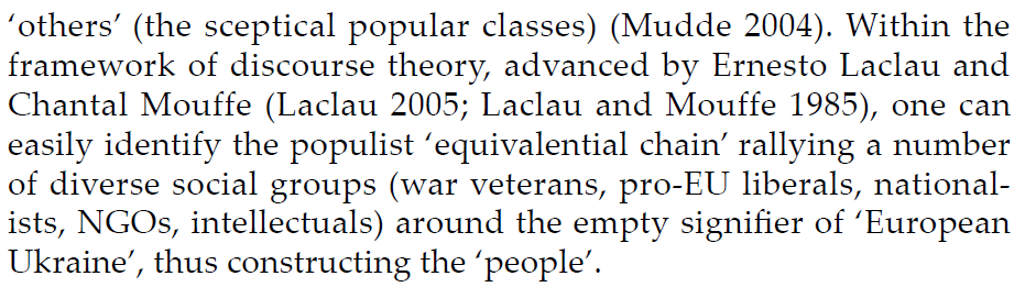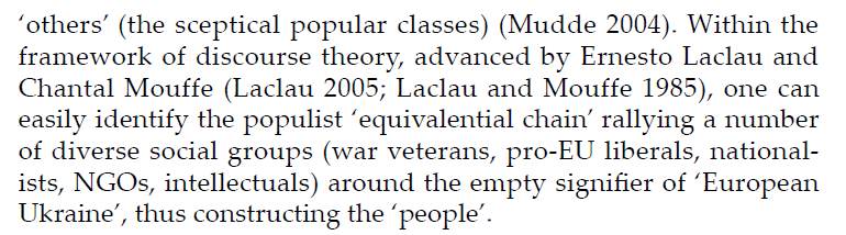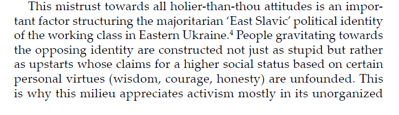 In the final empirical chapter 10, Gorbach applies the findings of Nina Eliasoph’s well known ‘avoidance of politics’ work to the Ukraine context. To be ‘authentic’ in lay discourse is to devalue what is seen as ‘ideological’ as dishonest. It’s ok to be a ‘volunteer’, but it’s important to mask one’s politics. There is ‘frontstage’ avoidance of ‘politics’. There are also ‘cynics’ who have strong and informed opinions but who cultivate disengagement. All of these positions are recognizable in postsocialist contexts. As in Don Kalb’s pioneering work, this reasoning produces the ‘neo-nationalist’ outlook well-known in other contexts.