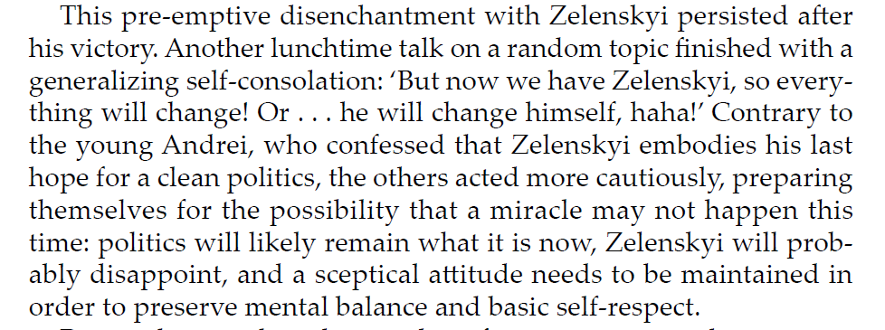 What follows is a useful discussion of the Zelenskyi phenomenon explained as a the outcome of this structural situation in Ukrainian lay politics. Gorbach is refreshingly balanced, not willing to preach to the choir, as other treatments of the ‘Zelensky effect’ have.