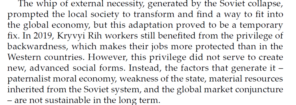 In chapter 5 – on Informality and the Workplace, Gorbach argues that instead of succumbing to anomie, Ukrainian workers implicitly gravitate towards a residual social project that owes a lot to Stalinist modernity, built upon the ultimate Fordist principles of enterprises as nodes of civilization. If this is so, the shopfloor should be a privileged fieldsite, likely to shed light on non-verbalized shared assumptions about hierarchy and social order. Of course researchers like me bemoan our marginalization as our colleagues focus on much more ‘sexy’ projects. Gorbach continues this focus in the follow chapter 6 on Paternalism in Decay. “Unable to accomplish the real subsumption of the labour process, the enterprises remain stuck in an extensive mode of economic development instead of a Toyota-like intensive mode based on technical innovations. However, such a shift would entail risks, costs and disruptions that are unacceptable to new enterprise owners. Instead of launching classic neoliberal managerial transformations, they chose to tacitly introduce new power configurations that ensured a residual paternalist consent, an undisturbed production process on the old technological and material basis, and the extremely low costs of capital upkeep. These low costs allow owners to preserve the machinery of the social wage and thereby help to protect their property rights in the case of a politico-corporate conflict.”