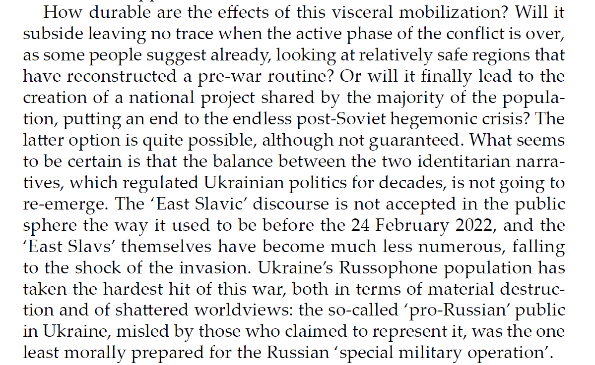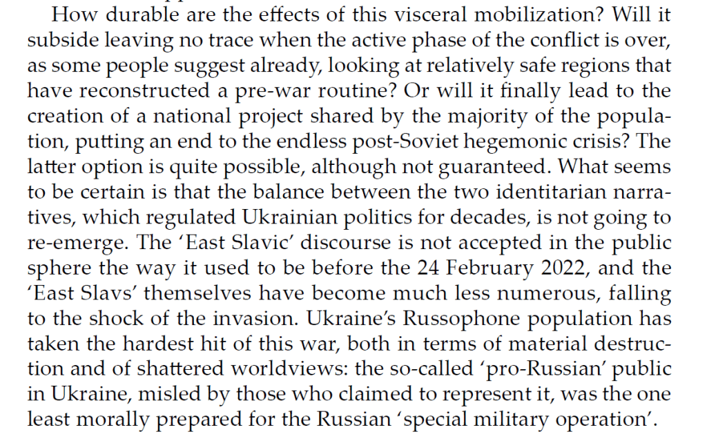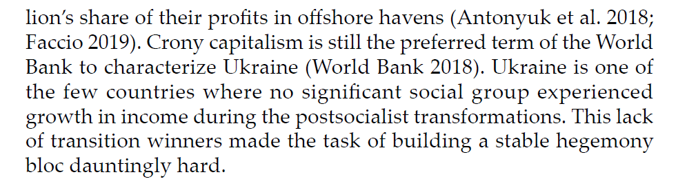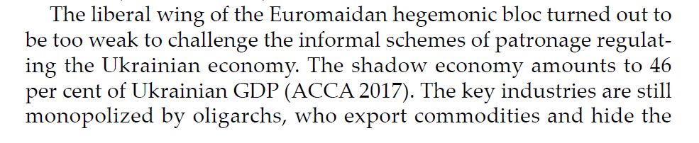 The failure of Ukrainian ethnic nationalism to muster its case outside its Western heartland led to its radicalization as documented by Andrew Wilson. The heterogeneous Ukrainian elites trod a fine line and their attempts to achieve social peace contributed to ongoing proverbial state weakness. Symbolic capital of the ‘national democrats’ competed with the ‘clanlike’ structural capital of the industrial cluster elites. I’m not going into detail about this part of the book, but it represents a welcome corrective to the usual blinders that pass as political history on 1990s Ukraine, notwithstanding the more impartial work done by scholars like Wilson and D’Anieri. Shout out to the use of the Marx’s ‘potatoes in a sack’ metaphor to describe the fragmented-yet-tied bloc of budget workers and city-making enterprises. What follows is a good account of the Orange Revolution, coming on the back of the rise of the resources of the ‘second-rank bourgeoisie…which grew strong enough to dare challenge the “closed access order” controlled by oligarchs’.