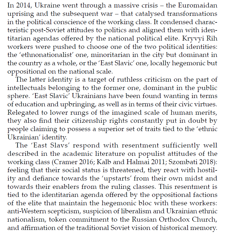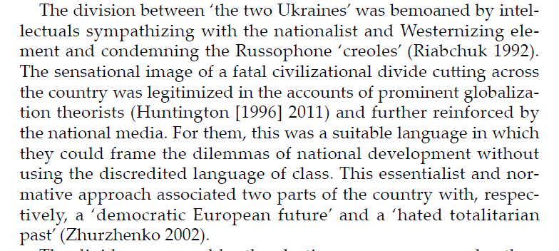 Chapter Two asks: Why does awareness of inequalities and class domination not prompt workers to contest this through collective political action in Ukraine? One answer is the informal alliances of old and new elites, and at first the Ukrainian nationalist project was weak. Here we have a great breakdown on the legitimation of the ‘fatal civilizational divide’: